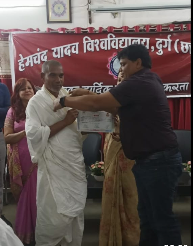 हेमचंद यादव विश्वविद्यालय दुर्ग, छत्तीसगढ़ के कुलपति डॉ. अरुणा पलटा एवं कुलसचिव डा.भूपेंद्र कुलदीप एवं कोर्स समन्वयक डॉ प्रशांत श्रीवास्तव द्वारा मेडल एवं सम्मान पत्र से सम्मानित किया गया।