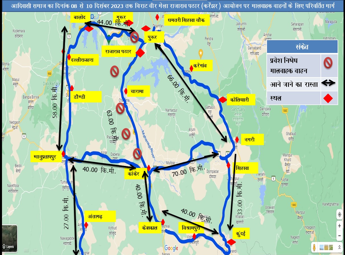 पुलिस अधीक्षक बालोद डॉ. जितेन्द्र कुमार यादव के निर्देशन पर, अतिरिक्त पुलिस अधीक्षक सुशील कुमार नायक के मार्गदर्शन एवं उप पुलिस अधीक्षक बोनीफॉस एक्का के पर्यवेक्षण में निरीक्षक राकेश ठाकुर प्रभारी यातायात के नेतृत्व में जिले में वीर मेला राजाराव पठार (कर्रेझर) में दिनांक 08 से 10 दिसंबर 2023 तक आयोजन को देखते हुए बड़ी मालवाहक वाहनों के लिए परिवर्तित मार्ग तैयार किया गया है।