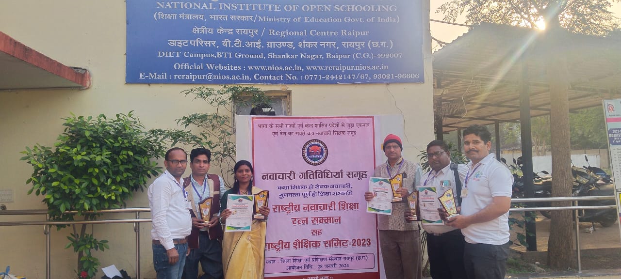 इसमें राजनांदगांव जिले के पांच नवाचारी शिक्षकों को राष्ट्रीय नवाचारी शिक्षा रत्न सम्मान से सम्मानित किया गया है. गुणवत्ता पूर्ण शिक्षा के लिए विषयगत कार्य एवं नवाचार,पाठ्य सहगामी गतिविधियों में बेहतर योगदान, बच्चों के सर्वांगीण विकास के लिए उत्कृष्ट एवं नवाचारी कार्य हेतु राजनांदगांव ब्लाक के शासकीय प्राथमिक शाला भोथीपारकला के सहायक शिक्षक ओमप्रकाश साहू, डोंगरगढ़ ब्लाक से शासकीय प्राथमिक शाला नंबर -1 की शिक्षिका प्रीतिबाला लाटिया, ओपन केटेगरी वर्ग के अंतर्गत प्रकृति विज्ञान शिक्षण में उत्कृष्ट योगदान हेतु अभिषेक शुक्ला शिक्षक शासकीय माध्यमिक शाला झिंझारी, डोंगरगढ़, डोंगरगांव ब्लाक से शासकीय प्राथमिक शाला बड़गांव चारभांठा के सहायक शिक्षक दयालदास साहू और छुरिया ब्लाक के शासकीय प्राथमिक शाला बिजेपार, छुरिया के सहायक शिक्षक गिरधारी सहारे को प्रशस्ति पत्र, स्मृति चिन्ह एवं पेन भेंट कर एक गरिमायी समारोह में राष्ट्रीय नवाचारी शिक्षा रत्न सम्मान से सम्मानित किया गया ।