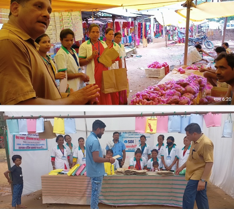 इसके तहत ग्राम पंचायत पालनार के साप्ताहिक बाजार में महिलाओं के द्वारा ’’सिंगल यूज प्लास्टिक, पॉलीथिन मुक्त करने हेतु ग्रामीण स्वरोजगार प्रशिक्षण संस्थान बाजार का आयोजन किया जा रहा है।