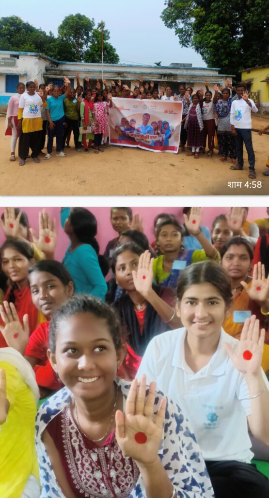 इस बार मासिक धर्म स्वच्छता दिवस पर “रेड डॉट चौलेंज” ‘चुप्पी तोड़ो खुलकर बोलो’ अभियान चलाकर महिलाओं एवं किशोरी बालिकाओं को माहवारी स्वच्छता पर जानकारी दिया गया। एक दिवसीय कार्यक्रम में माहवारी पर शर्म एवं झिझक छोड़कर खुलकर चर्चा, इसी परिप्रेक्ष्य में किशोरी बालिकाओं एवं महिलाओं ने सामुदायिक जागरूकता हेतु हाथो में लाल गोले से रंगकर शपथ लिया गया कि माहवारी पर शर्म एवं झिझक छोड़कर खुलकर चर्चा करेंगे, जिससे एक स्वस्थ समृद्ध सुपोषित समाज का निर्माण हो सके।
