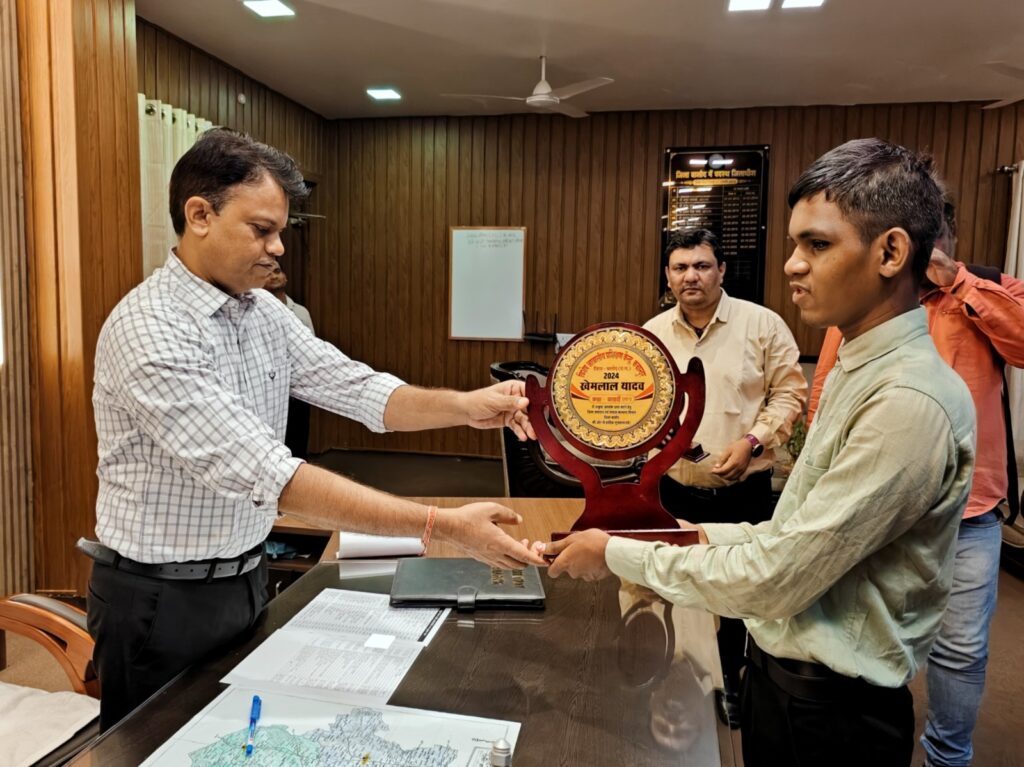 कलेक्टर इन्द्रजीत सिंह चन्द्रवाल ने आज संयुक्त जिला कार्यालय अपने कक्ष में जिले के गुण्डरदेही विकास खण्ड के दिव्यांग विद्यार्थियों के विशेष आवासीय प्रशिक्षण केन्द्र कचान्दुर के विद्यार्थी खेमलाल यादव एवं प्रियांशु सोनकर को स्मृति चिन्ह भेंटकर सम्मानित किया।