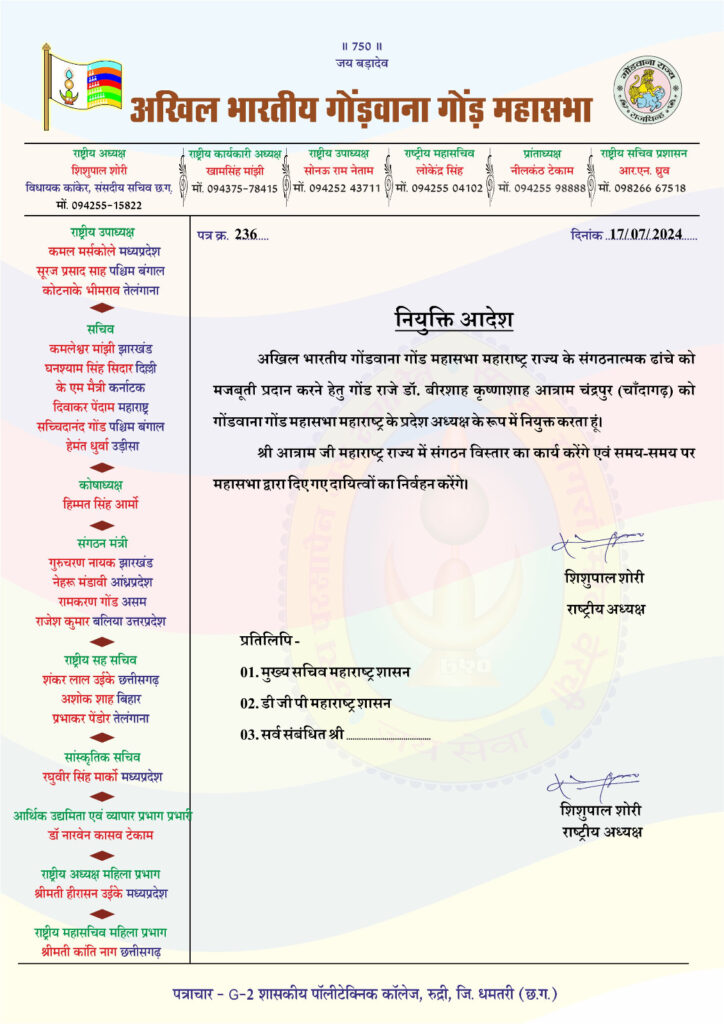अखिल भारतीय गोंडवाना गोंड महासभा महाराष्ट्र राज्य के संगठनात्मक ढांचे को मजबूती प्रदान करने हेतु गोंड राजे डॉ. बीरशाह कृष्णाशाह आत्राम चंद्रपुर (चाँदागढ़) को गोंडवाना गोंड महासभा महाराष्ट्र के प्रदेश अध्यक्ष के रूप में राष्ट्रीय अध्यक्ष शिशुपाल शोरी द्वारा नियुक्ति आदेश जारी की गई है।