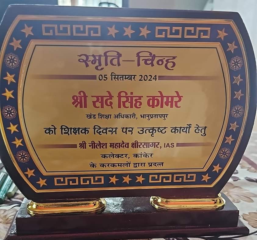 भानुप्रतापपुर के खण्ड शिक्षा अधिकारी सदेसिह कोमरे सर को शिक्षा के क्षेत्र मे अल्प समय पर शासकीय योजनाओ तथा ,जिला प्रशासन के कार्यक्रम को त्वरित सीधे सीधे अन्तिम लक्ष्य तक पहुंचाने में अद्भुत मिसाल कायम करने के लिए उन्हें शिक्षक दिवस के मौके पर जिला कलेक्टर निलेश महादेव क्षीरसागर द्वारा सम्मानित किया गया।