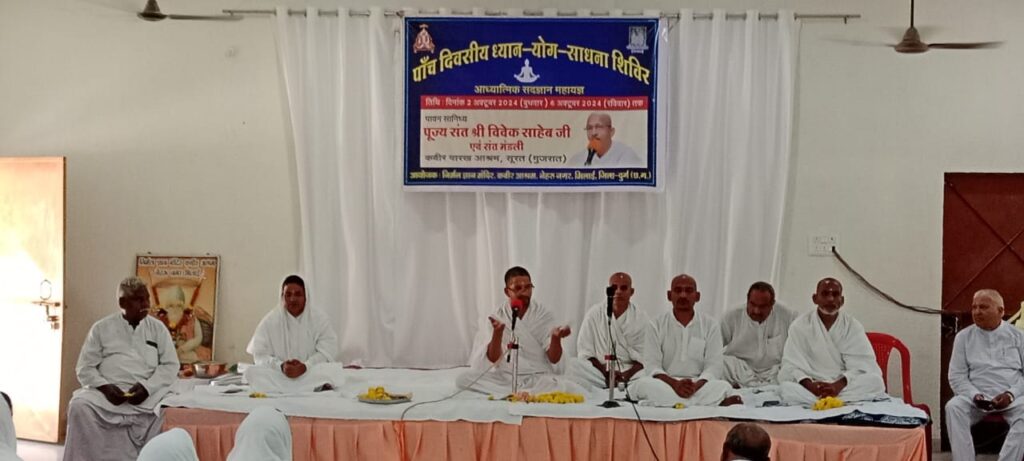 निर्मल ज्ञान मंदिर कबीर आश्रम नेहरू नगर भिलाई में 2 अक्टूबर 2024 से 6 अक्टूबर 2024 तक पांच दिवसीय ध्यान योग साधना शिविर का आयोजन किया गया। इस अवसर पर पूज्य संत श्री विवेक साहेब एवम संत मंडली कबीर पारख आश्रम सूरत गुजरात के अलावा विवेक साहेब, विजय साहेब, निक्तेश्वर साहेब, साध्वी सुमन साहेब, साध्वी दुनिष्टा, सुप्रिया साहेब, अंत राम साहेब और कबीर पारख आश्रम से अनेक संत और साध्वी उपस्थित रहे। इस कार्यक्रम में सभी लाभार्थियों का निःशुल्क पंजीयन किया गया था। दो सत्रों में आयोजित इस कार्यक्रम का पहला सत्र प्रातः 7 से 10 बजे तक और द्वितीय सत्र 2.30 से 5.30 तक चला।