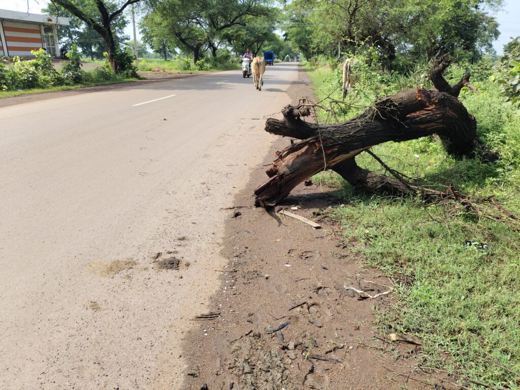 सड़क किनारे गिरे पेंड़ की लकड़ी से टकराकर लहूलुहान हो रहे हैं बाइक चालक
